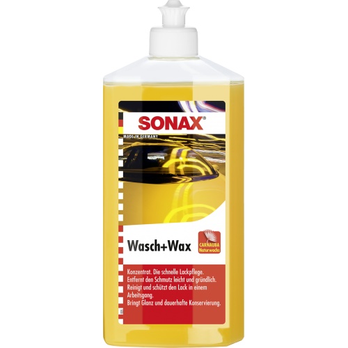 Wasch & Wax 500ml von Sonax entfernt gründlich Verschmutzungen und überzieht den Autolack mit einem dauerhaften Schutzfilm aus natürlichem Carnauba-Wachs. Reinigt und schützt den Lack in einem Arbeitsgang. Bringt bei der Anwendung glanz und dauerhafte Konservierung.